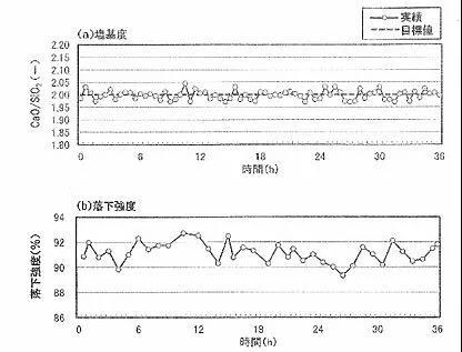 可以看到,即便在日本成熟的钢厂中,设定碱度值为 2.00 的情况下,实际生产的碱度值 也有着大幅度波动;而所得烧结矿质量(落下强度)也有着很大波动,且质量偏低,普遍低 于 90。